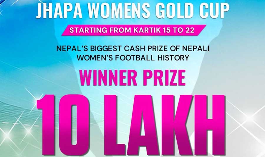 नेपालकै अहिलेसम्मकै सर्वाधिक पुरस्कार राशिको झापा महिला गोल्डकप अन्तर्राष्ट्रिय आमन्त्रण नकआउट फुटबल प्रतियोगिता यही कात्तिक १५ गतेदेखि २२ गतेसम्म हुँदैछ ।