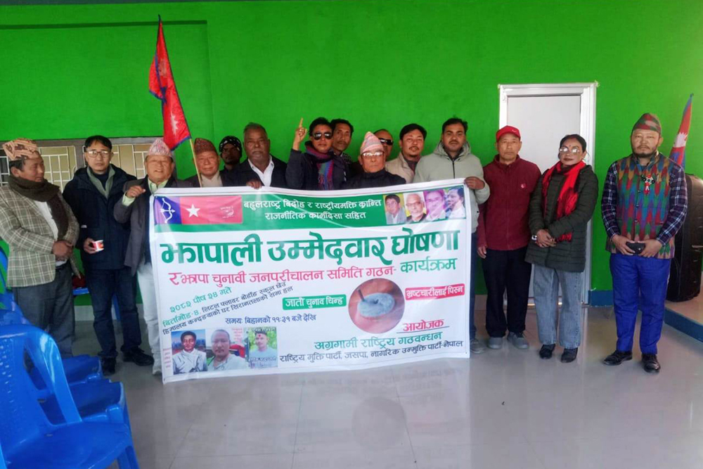 झापा, २५ पुस । आगामी फागुन २१ मा हुने प्रतिनिधि सभा निर्वाचनका लागि राष्ट्रिय मुक्ति पार्टी, जनता समाजवादी पार्टी र नागरिक उन्मुक्ति पार्टी नेपालले उम्मेदवार घोषणा गरेको छ ।