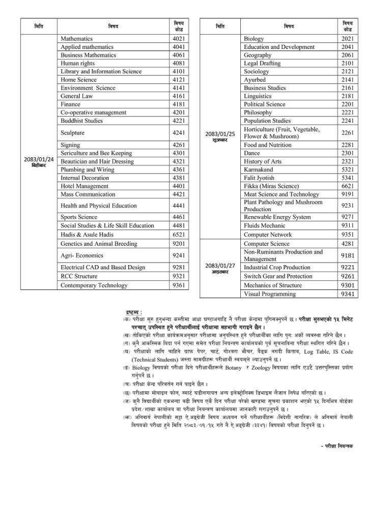 बैशाख १४ गते सोमबारदेखि शुरु हुने परीक्षा २७ गते आइतबारसम्म चल्नेछ । परीक्षा बिहान ८ बजेदेखि ११ बजेसम्म सञ्चालन हुने बोर्डले जनाएको छ ।