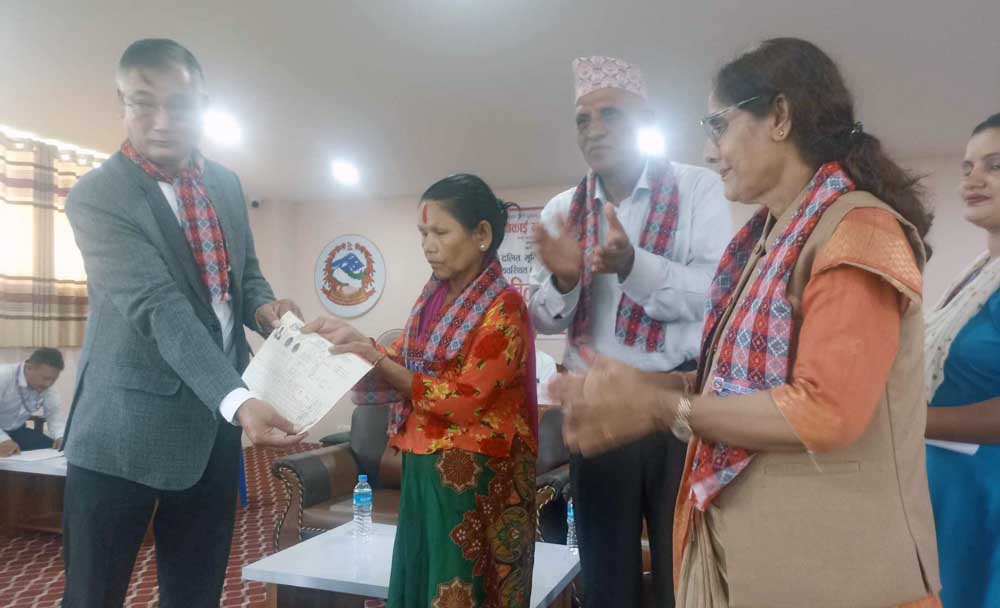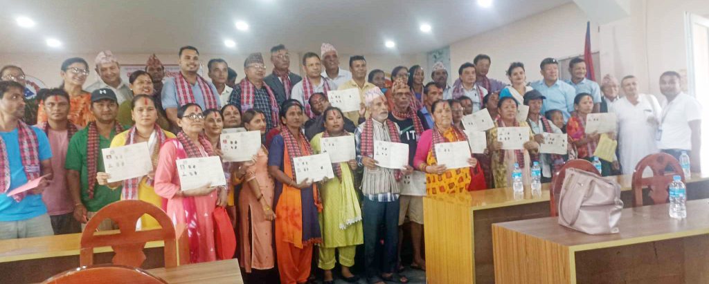 नगरपालिकामा लामो समयदेखि बसोबास गर्दै आउँनुभएका र देशभर आफ्नो तथा आफ्नो परिवारको नाममा जमिन नभएका २४ घर परिवारलाई निशुल्क बसोबासीको आधारमा जमिनको लालपुर्जा प्रदान गरिएको कनकाई नगरपालिका प्रमुख राजेन्द्रकुमार पोखरेलले जानकारी दिनुभयो ।