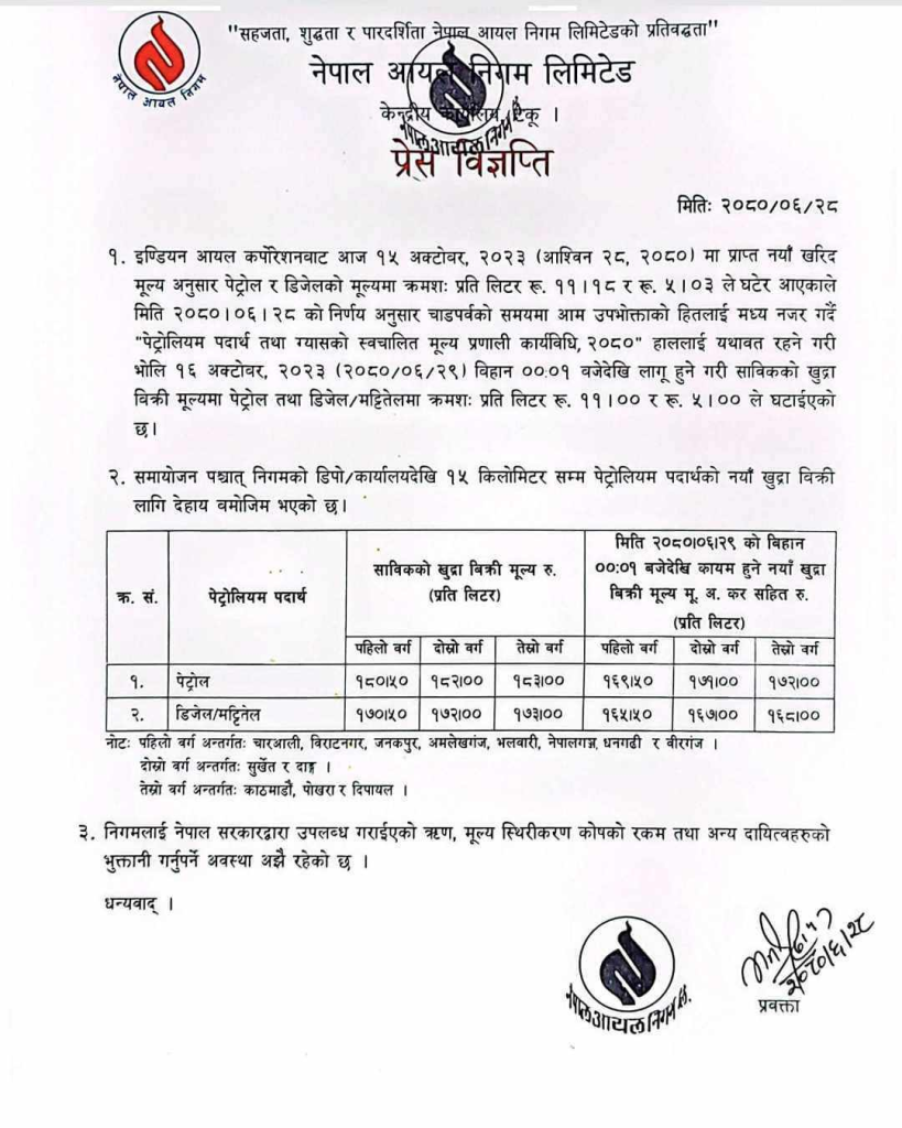 भारतीय आयल कर्पोरेसनबाट घटेर नयाँ मूल्य प्राप्त भएका कारण मूल्य समायोजन गरिएको निगमले जनाएको छ ।