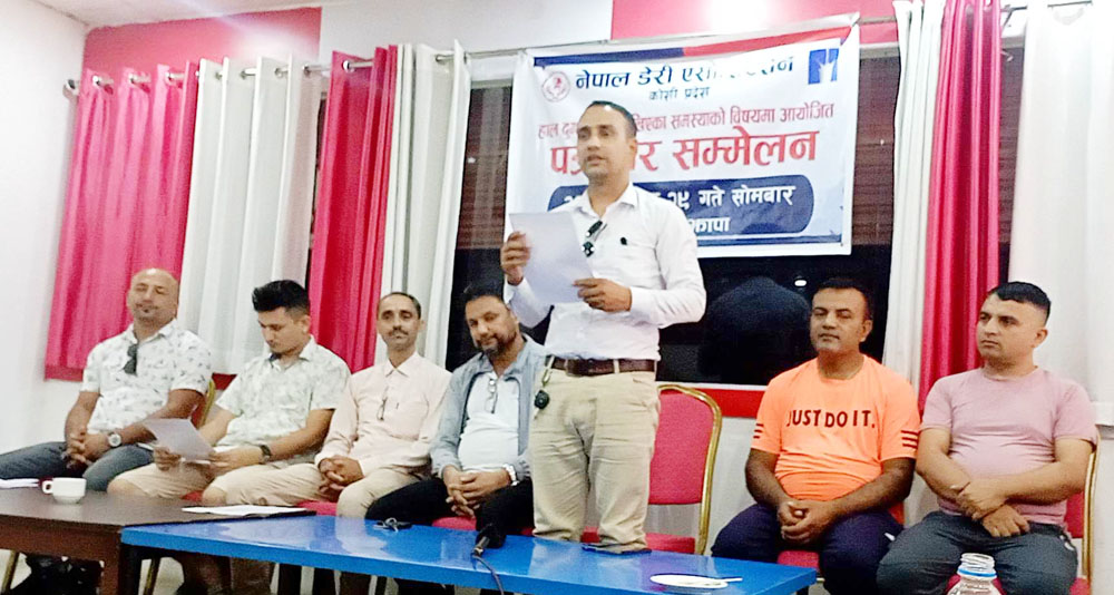 नेपाल डेरी एसोसिएसन कोशी प्रदेशले आज झापाको बिर्तामोडमा पत्रकार सम्मेलनको आयोजना गरी सरकारले दूधको मूल्य बढाएपछि दुग्ध व्यवसाय संकटमा परेको जनाएको हो । सरकारले किसानले उत्पादन गरेको दूधको मूल्यबृद्धि गरेपछि अन्तर्राष्ट्रिय बजारमा प्रतिस्पर्धा गर्न सक्ने अवस्था नरहेको एसोसिएसनका कोशी प्रदेश अध्यक्ष गंगाबहादुर खड्काले बताउनुभयो ।