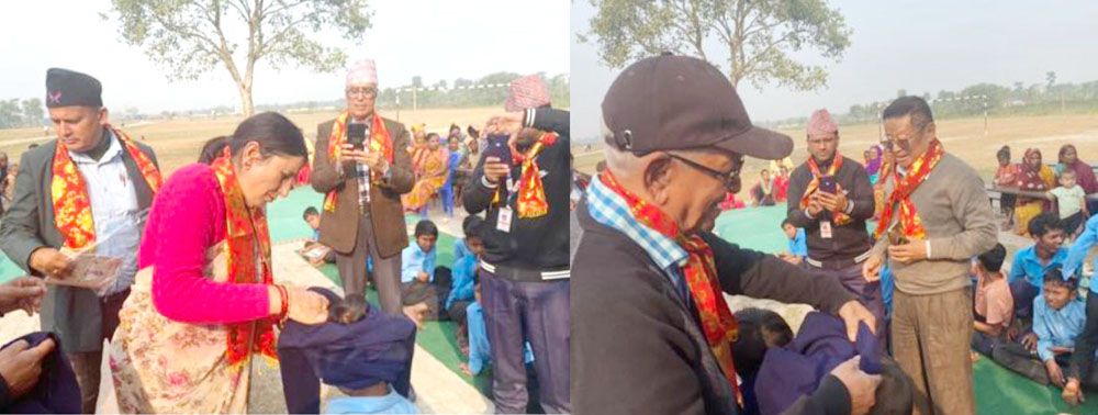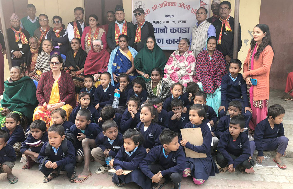भद्रपुर, २७ मंसिर । रुद्र–गौरी श्री–अम्बिका ओली प्रतिष्ठान भद्रपुर झापाले आज विद्यार्थी र ज्येष्ठ नागरिकलाई न्यानो कपडा र विद्यालयलाई खेल सामग्री प्रदान गरेको छ ।