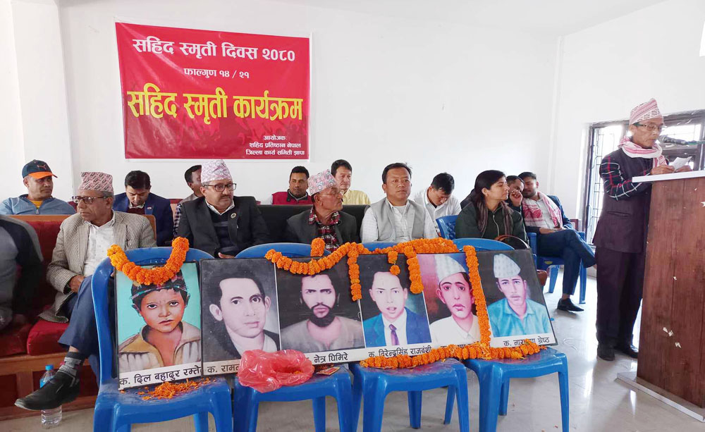 सहिद स्मृति प्रतिष्ठान नेपाल झापाले आज बिर्तामोडस्थित गौरीशंकर स्मृति प्रतिष्ठानको सभा हलमा सहिद स्मृति कार्यक्रमको आयोजना गरी उनीहरुलाई सम्मान गरेको हो ।
