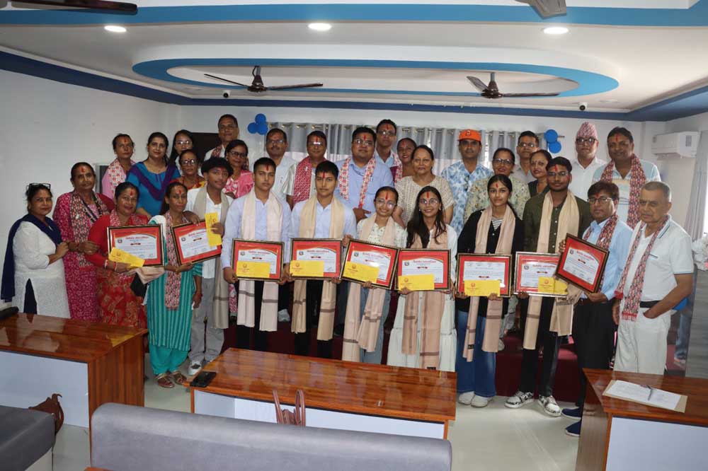 नगरपालिका अन्तर्गत रहेका सामुदायिक तथा संस्थागत विद्यालयमा अध्ययनरत ९ जना विद्यार्थीलाई दोसल्ला ओढाएर नगद ५ हजार रुपैयाँसहित सम्मान गरिएको हो ।
