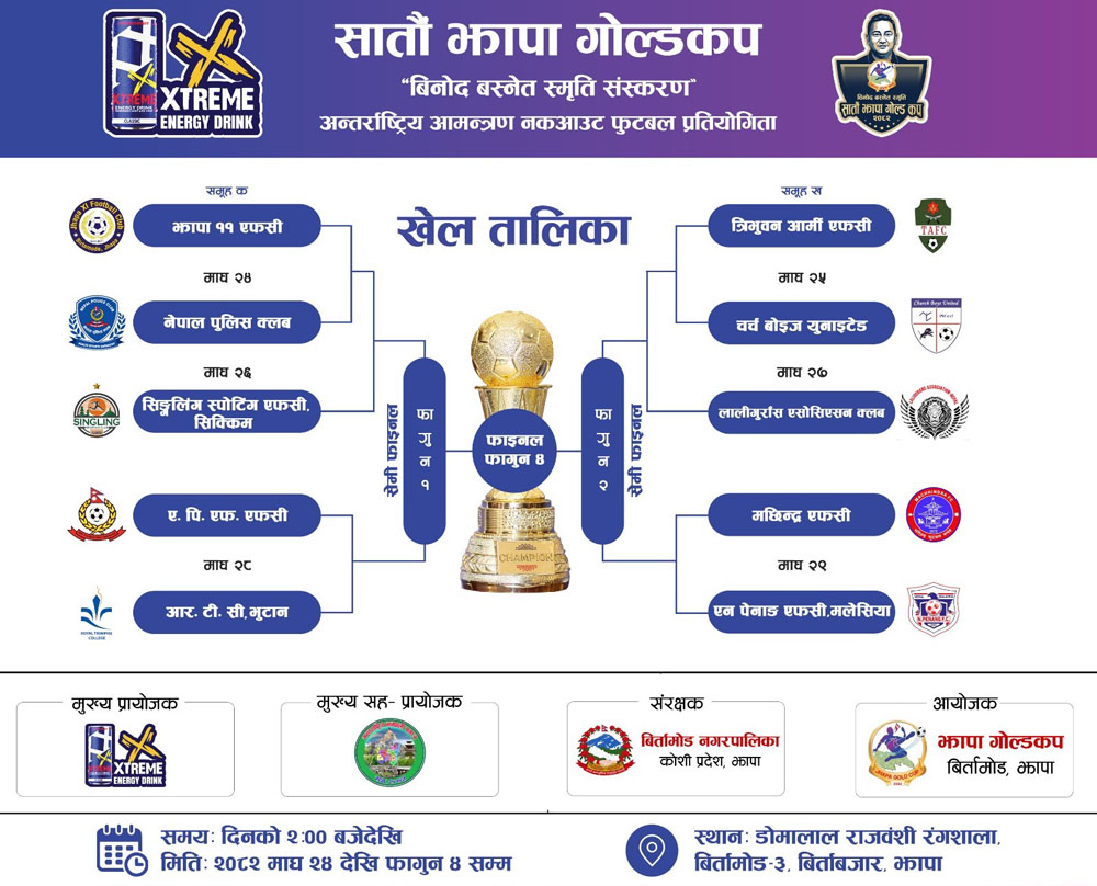 बिर्तामोड, १९ माघ । एक्स्ट्रिम सातौँ झापा गोल्डकप विनोद बस्नेत स्मृति संस्करणको खेल तालिका सार्वजनिक गरिएको छ । आयोजक झापा गोल्डकपले आज सामाजिक सञ्जालमार्फ खेल तालिका सार्वजनिक गरेको हो ।