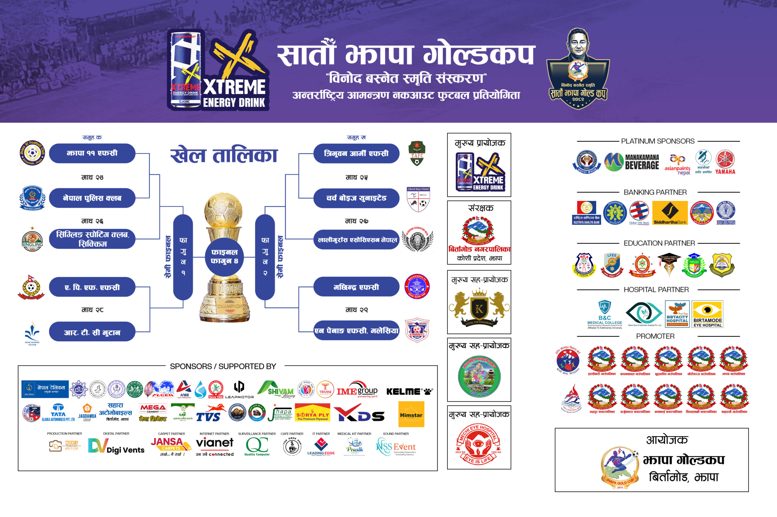 झापा गोल्डकपका पूर्वअध्यक्ष विनोद बस्नेतको स्मृतिमा समर्पित सातौं संस्करण हुन गइरहेको छ । प्रतियोगिताको विजेता टिमले नगद १५ लाख र उपविजेताले नगद ७ लाख ५० हजार रुपैयाँ पाउनेछन् ।