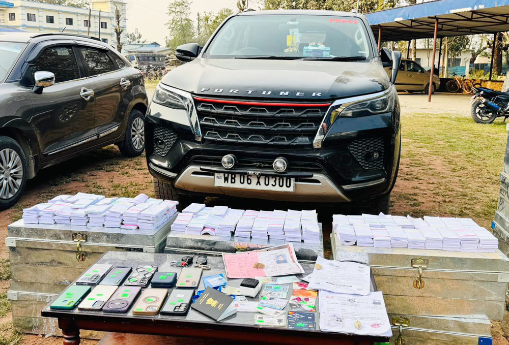 अनुसन्धान क्रममा मेचिनगर नगरपालिका–४ आमडाँगीस्थित स्थानबाट २१ वटा टिनको बाक्सा र २३७ बन्डल नोट आकारको सादा कागज बरामद गरिएको छ । साथै, सरकारी छाप, दस्तखत किर्ते कागजात, नेपाल सरकारको निशान छाप, नेपाल प्रहरीको नक्कली परिचयपत्र लगायतका कागजात समेत बरामद गरिएको प्रहरीले जनाएको छ ।