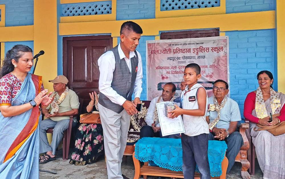भद्रपुर, १० बैशाख । झापाको भद्रपुर नगरपालिका–९ पोकापाडास्थित बालज्योति प्रतिष्ठान इङ्गलिस स्कूलले आज संस्थापक सदस्य सम्मान र उत्कृष्ट अंक ल्याउने विद्यार्थीलाई पुरस्कृत गरेको छ ।
