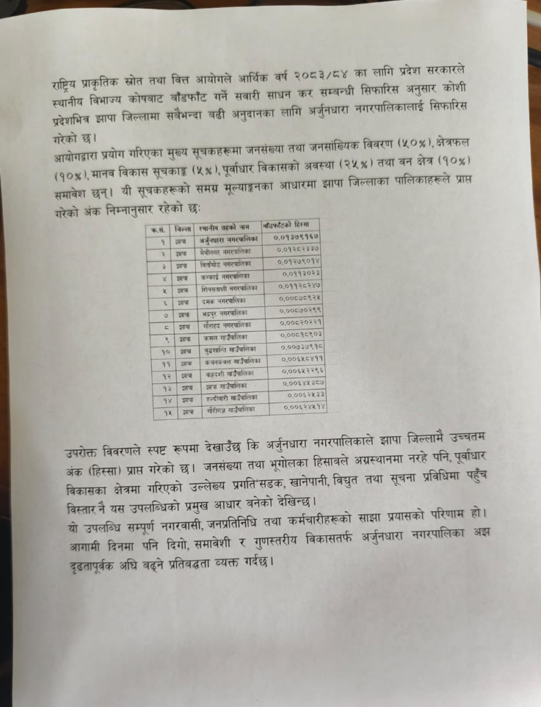 आयोगले आर्थिक वर्ष २०८३–८४ का लागि प्रदेश सरकारले स्थानीय विभाज्य कोषबाट बाँडफाँट गर्ने सवारी साधन कर सम्बन्धी सिफारिस अनुसार कोशी प्रदेशभित्र झापामै सबैभन्दा बढी अनुदानका लागि अर्जुनधारा नगरपालिकालाई सिफारिस गरेको हो ।