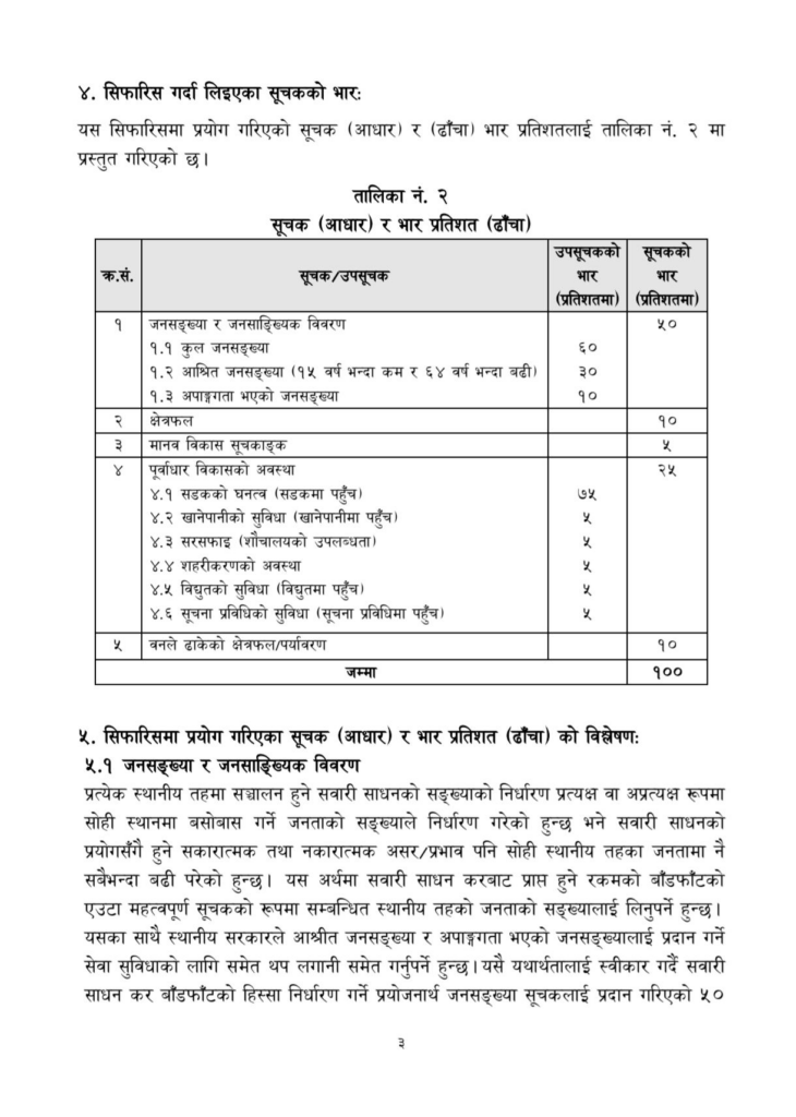 आयोगद्वारा प्रयोग गरिएका मुख्य सूचकहरूमा जनसंख्या तथा जनसांख्यिक विवरण ५० प्रतिशत, क्षेत्रफल १० प्रतिशत, मानव विकास सूचकाङ्क ५ प्रतिशत, पूर्वाधार विकासको अवस्था २५ प्रतिशत र वन क्षेत्र १० प्रतिशत समावेश छन् । यी सूचकहरूको समग्र मूल्याङ्कनका आधारमा झापा जिल्लाका पालिकाहरूमध्ये अर्जुनधारालाई सबैभन्दा बढी अनुदानका लागि सिफारिस गरेको छ ।
