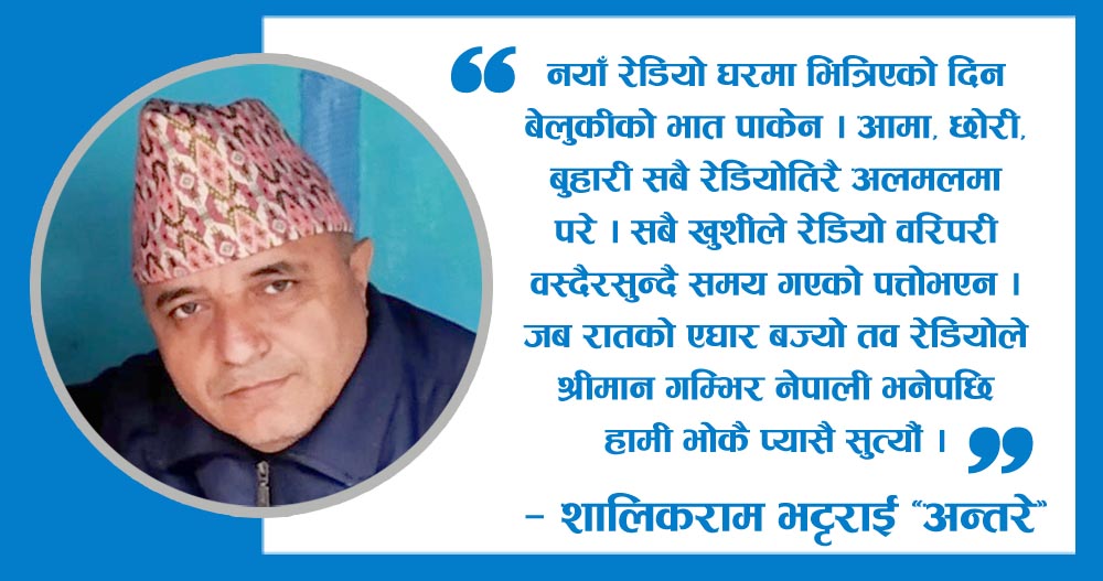 घरमा रेडियो आएको करिव एकमहिना भएको हुँदो हो । हाम्रो घरका सदस्यले रेडियो सुन्ने र आ-आफ्नो कामकाज गर्ने लय पक्डिसकेका थिए । आफुलाइ मन पर्ने कार्यक्रम सुन्न तोकिएको काम सकेर रेडियोको छेउमा आएर बेलैमा बस्ने सुन्ने, अर्थात काममा बाधा नपार्ने। रेडियो प्राय बिहान देखि राती सम्म घरको मूलढोकाको दाहिने पट्टिको फलामको काँटीमा झुण्डिएर अविरल बजिनै रहन्थ्यो ।बेला-बेलामा ठुल्दाइ बेटारी फेर्नुहुन्थ्यो ।