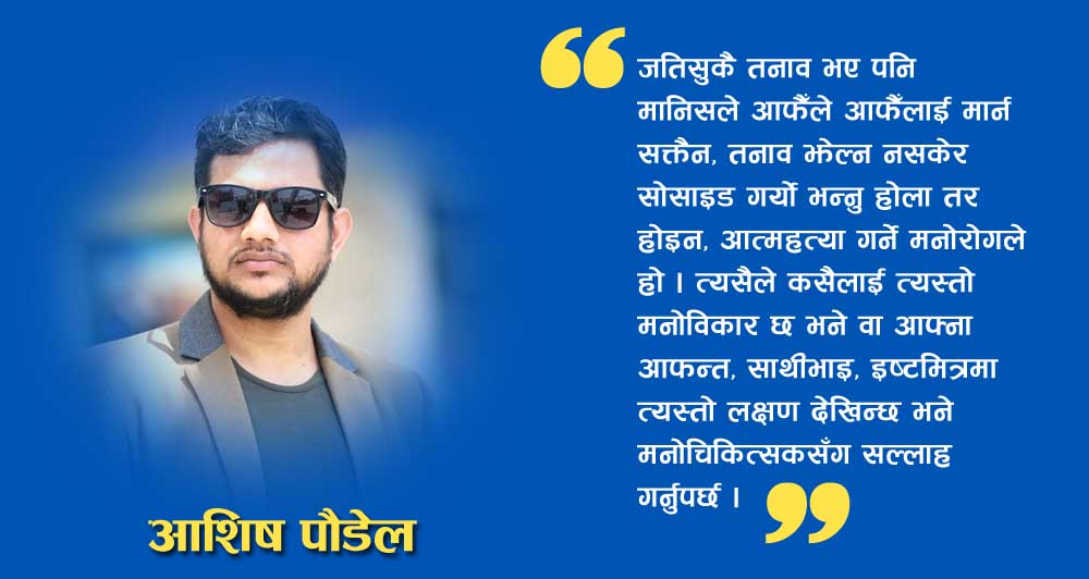 नेपालका यम बुद्धले किन सोसाईड गरे होलान? जतिसुकै तनाव भएपनि मानिसले आफैले आफैलाई मार्न सक्तैन, तनाव झेल्न नसकेर सोसाईड गर्यो भन्नु होला तर होईन, आत्महत्या गर्ने मनोरोगले हो । त्यसैले कसैलाई त्यस्तो मनोविकार छ भने, वा आफ्ना आफन्त,साथीभाई, ईष्टमित्रमा त्यस्तो लक्षण देखिन्छ भने मनोचिकित्सकसंग सल्लाह गर्नुपर्छ ।