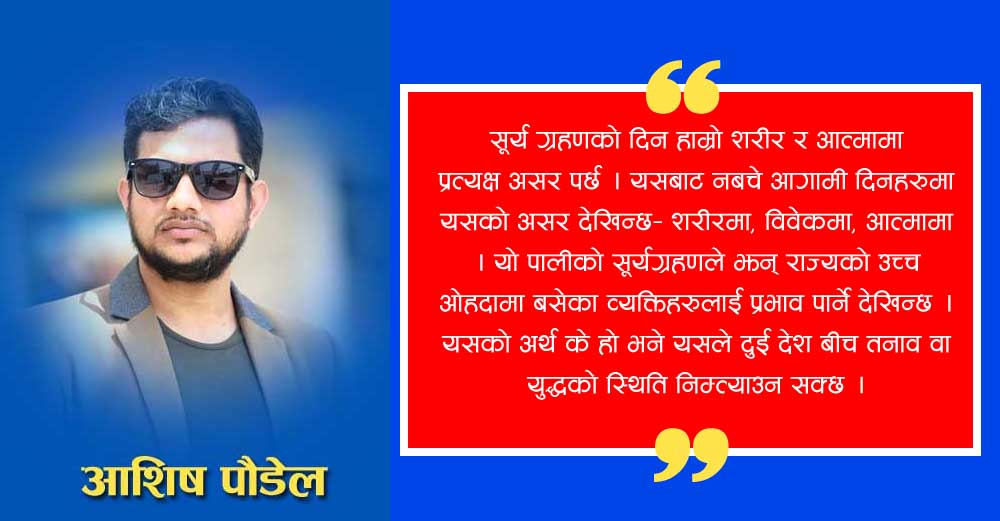 सूर्य ग्रहणको दिन हाम्रो शरीर र आत्मामा प्रत्यक्ष असर पर्छ । यसबाट नबचे आगामी दिनहरुमा यसको असर देखिन्छ– शरीरमा, विवेकमा, आत्मामा । यो पालीको सूर्यग्रहणले झन् राज्यको उच्च ओहदामा बसेका व्यक्तिहरुलाई प्रभाव पार्ने देखिन्छ । यसको अर्थ के हो भने यसले दुई देश बीच तनाव वा युद्धको स्थिति निम्त्याउन सक्छ ।