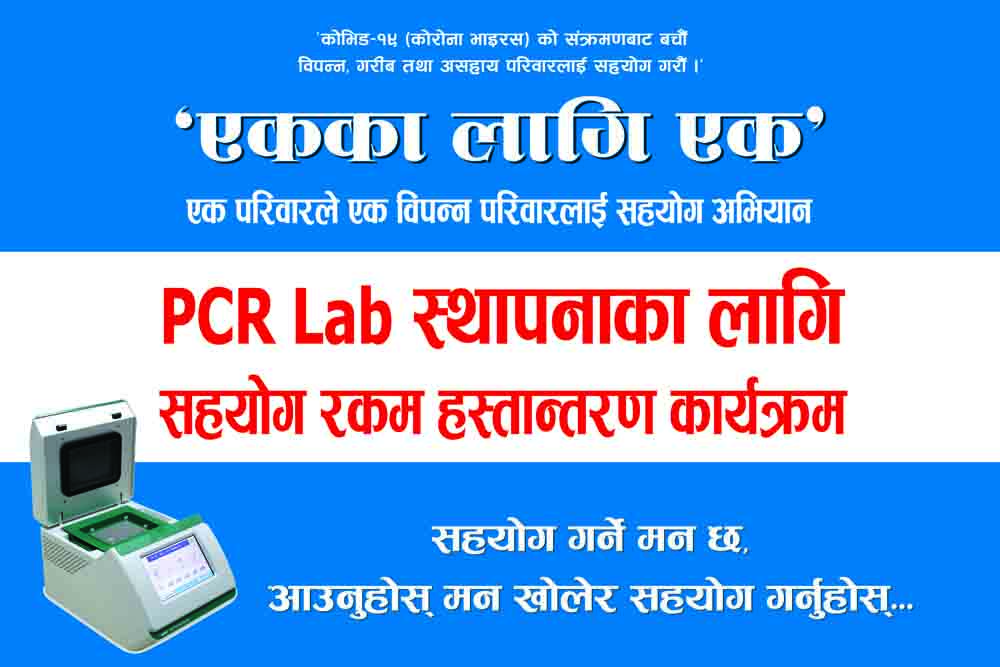 कोरोना भाइरसको बढ्दो सङ्क्रमणका कारण मुलुक नै आक्रान्त बनिरहेका बेला गत वैशाख १९ गतेदेखि झापामा ‘एकका लागि एक अभियान’ शुरु भएको थियो । अभियान शुरु भएसँगै एक हुनेखाने व्यक्तिले नहुने ९विपन्न० एक परिवारलाई कम्तीमा रु दुई हजार बराबरको खाद्यान्य सहयोग गर्न शुरु गरिएको अभियानमा अहिले एक हजार २०० जना जोडिएका छन् । उनीहरुबाट झापामा पिसीआर मेसिन स्थापनाका लागि रु एक करोड २० लाख जुटेको छ ।