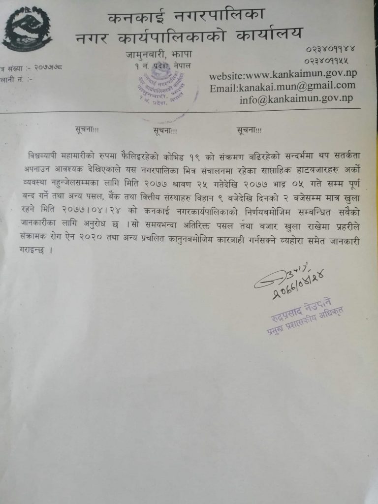बिर्तामोड, २४ साउन । विश्वव्यापी रुपमा फैलिँदै गएको कोरोना भाइरस कोभिड–१९ को संक्रमण नियन्त्रण गर्न कनकाई नगरपालिकाले हाट बजार बन्द गरेको छ ।