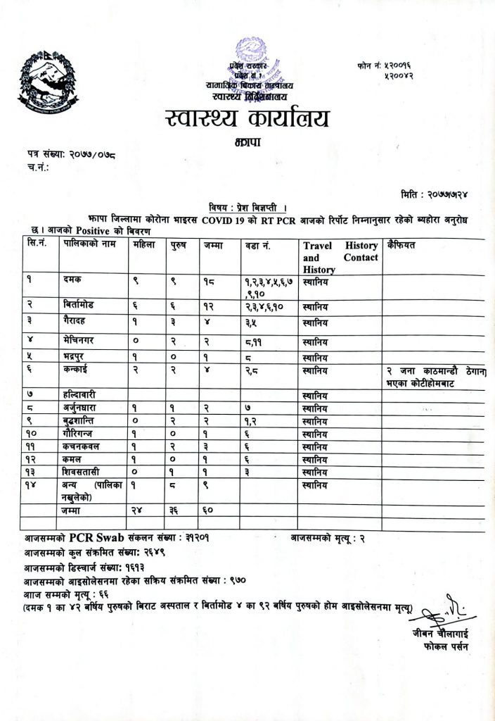 त्यस्तै, झापा आज ६० जना कोरोना संक्रमित थपिएका छन् । ११ स्थानीय तहका ५१ जना र स्थानीय तह नखुलेका ९ जना गरी ६० जनामा कोरोना संक्रमण पुष्टि भएको स्वास्थ्य कार्यालय झापाले जनाएको छ ।