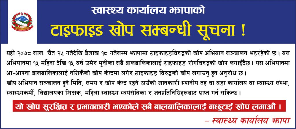 स्वास्थ्य कार्यालय झापाको टाइफाइड खोपसम्बन्धी सूचना ! Facebook Comments Box झापा अनलाइन+ postsBioझापा अनलाइन बिर्तामोडबाट सञ्चालित अनलाइन न्यूज पोर्टल हो । यसमा प्रकाशित समाचारबारे कुनै प्रतिक्रिया भए jhapaonline75@gmail.com मा इमेल गर्नुहोला ।झापा अनलाइनhttps://jhapaonline.com/author/jhapaonlineनुहाउने क्रममा डुबेर १ युवकको मृत्युझापा अनलाइनhttps://jhapaonline.com/author/jhapaonlineनेपालले युएईलाई दियो २०१ रनको लक्ष्यझापा अनलाइनhttps://jhapaonline.com/author/jhapaonlineआज वैशाख १२ महाभूकम्प गएको दिनझापा अनलाइनhttps://jhapaonline.com/author/jhapaonlineताप्लेजुङमा अव्यवस्थित संरचना हटाउन ७ दिने अल्टिमेटम