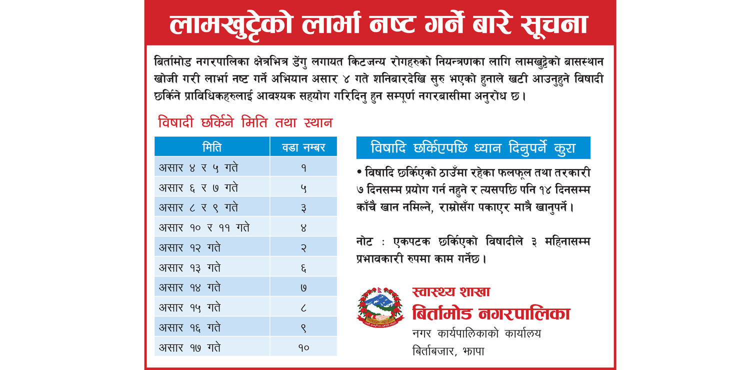 बिर्तामोड नगरपालिकाको सूचना ! Facebook Comments Box झापा अनलाइन+ postsBioझापा अनलाइन बिर्तामोडबाट सञ्चालित अनलाइन न्यूज पोर्टल हो । यसमा प्रकाशित समाचारबारे कुनै प्रतिक्रिया भए jhapaonline75@gmail.com मा इमेल गर्नुहोला ।झापा अनलाइनhttps://jhapaonline.com/author/jhapaonlineनुहाउने क्रममा डुबेर १ युवकको मृत्युझापा अनलाइनhttps://jhapaonline.com/author/jhapaonlineनेपालले युएईलाई दियो २०१ रनको लक्ष्यझापा अनलाइनhttps://jhapaonline.com/author/jhapaonlineआज वैशाख १२ महाभूकम्प गएको दिनझापा अनलाइनhttps://jhapaonline.com/author/jhapaonlineताप्लेजुङमा अव्यवस्थित संरचना हटाउन ७ दिने अल्टिमेटम