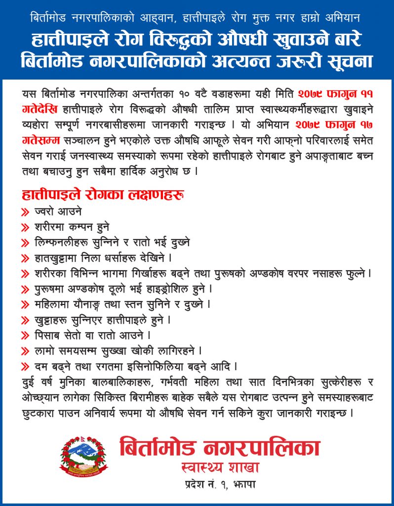 हात्तीपाइले रोगविरुद्धको आम औषधि सेवन गर्नेबारे बिर्तामोड नगरपालिकाको अत्यन्त जरुरी सूचना ! Facebook Comments Box adminWebsite | + postsBioadminhttps://jhapaonline.com/author/adminशहीद स्मारक ए डिभिजन लिग : संकटाद्वारा पुलिस पराजित, जावलाखेल र एपीएसफ अंक बाँडेadminhttps://jhapaonline.com/author/adminसहारा नेपाल साकोस बिर्तामोड (झापा)को कोटेशन आह्वानसम्बन्धी सूचना !adminhttps://jhapaonline.com/author/admin१६५ निर्वाचन क्षेत्रको चुनावी विवरण मेरो प्रतिनिधि डटकममाadminhttps://jhapaonline.com/author/adminजथाभावि निर्माण गरिएका सडकका डिभाइडर बन्द गरिने