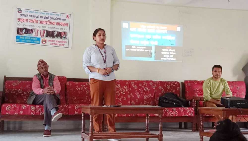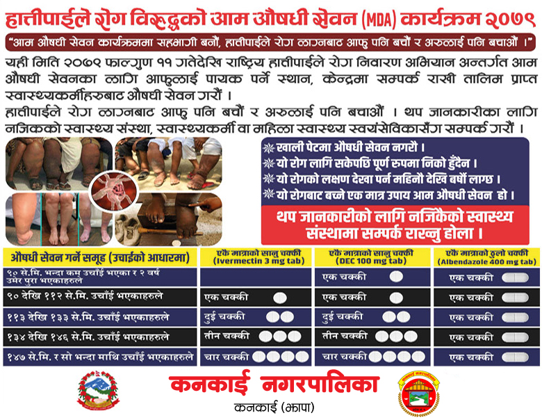 यता, कनकाईका प्रमुख प्रशासकीय अधिकृत मोहनप्रसाद न्यौपानेले आगामी ११ गते बाट सुरु हुने औसधि सेवन कार्यक्रमका लागि खटिनुभएका ६० जना स्वास्थ्यकर्मी र २२ जना स्वयम् सेविकाहरु सबैको घर घरमा आएर औसधि खुवाउने हुनाले स्वास्थ्य मन्त्रालयले तोकिएका मानिसले हात्तीपाइले विरुद्धको औसधि खाएर सहयोगरी रोग लाग्नबाट बच्न आग्रह गर्नुभएको छ।