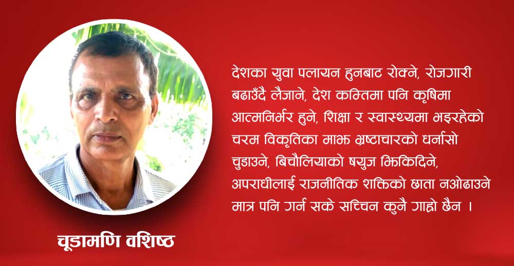 राजनीतिबाट लाभ लिनेहरु बाहेक बाँकी सबै जनतामा निराशा छाएको छ । नेतृत्वको चर्तिकला कसैलाई मन परेको छैन । राजनीतिको सेवाभित्र आर्थिक चलखेलका वितण्डा आणविक भट्टीबाट चुहेको ज्यानमारा विषाक्त ग्याँसले जस्तै राष्ट्रको जीवनलाई घिटिक–घिटिक पार्दोछ । यसले राजनीतिक नेतृत्वलाई त नकारात्मक असर पार्छ नै, विश्वका नजरमा मुलुकलाई नै तल ओराल्छ । पार्टीहरुका कार्यकर्ता शुभेच्छुकहरुले ‘राम राम !’ सम्म त भन्लान्, तर काँधै हाल्ने अवस्था र मनस्थितिमा कोही पनि देखिंदैनन् । त्यसैले प्रत्येक पार्टीको नेतृत्व सच्चिने र सकिनेको भञ्ज्याङमा उभिन पुगेका हुन् ।