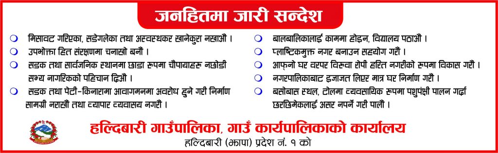 झापा, ५ असोज । हल्दिबारी गाउँपालिकाले अतिविपन्न परिवार र ज्येष्ठ नागरिकलाई निःशुल्क एम्बुलेन्स सेवा सुरुआत गरेको छ । हल्दिबारीले विपन्न र ८० वर्ष पूरा गरेका ज्येष्ठ नागरिकलाई पालिका तथा बाहिरका अस्पतालसम्म पुर्याउन निःशुल्क एम्बुलेन्स सेवा बिहीबारदेखि सुरु गरेको हो ।