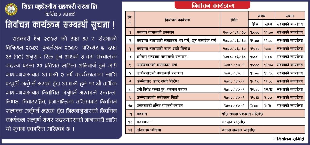 शिक्षा बहुउद्देश्यीय सहकारी संस्था लि. बिर्तामोड, झापाको निर्वाचन सम्बन्धी सूचना !