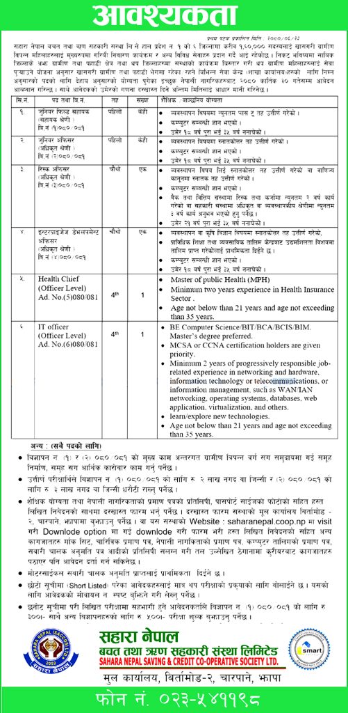 सहारा नेपाल बचत तथा ऋण सहकारी संस्थाको कर्मचारी आवश्यकता सम्बन्धी सूचना ।