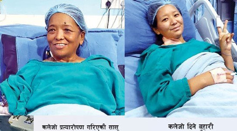 झापा, ३० असोज । सहिद धर्मभक्त राष्ट्रिय प्रत्यारोपण केन्द्रमा १४ औँ पटक कलेजो प्रत्यारोपण भएको छ । काठमाडौँकी ६२ वर्षीया महिलाको कलेजो प्रत्यारोपण भएको हो । उनलाई ३७ वर्षीया बुहारीले कलेजो दान गरेकी थिइन् ।