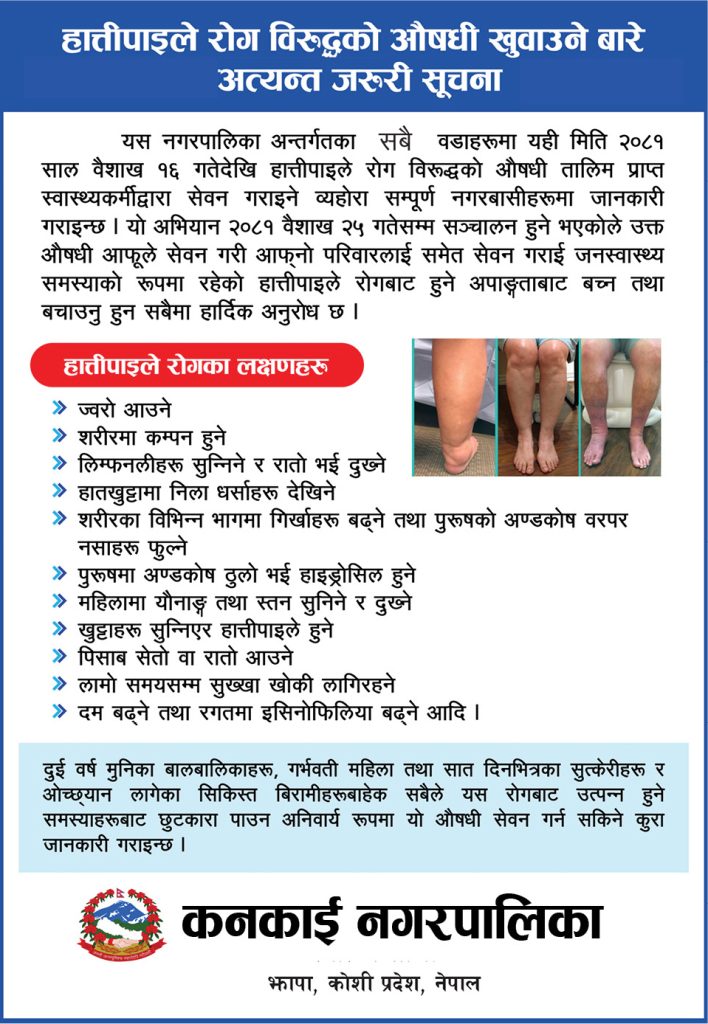 राष्ट्रिय हात्तीपाइले रोग निवारणका लागि वितरण कार्यक्रम अन्तरगत नगरमा बैशाख १६ देखि २२ गतेसम्म राष्ट्रिय हात्तीपाइले रोग निवारण अभियान अन्तरगत आम औषधी वितरण कार्यक्रम सञ्चालन गरिने अभियान कनकाई नगरको जनसंख्या करिव ५३ हजार रहेको र त्यो मध्ये यस बर्ष ५१ हजारलाई औषधी सेवन गराइने लक्ष्य रहेको कनकाई स्वास्थ्य शाखाकी सिनियर अनमी टीका दवाडीले जानकारी दिनुभयो ।
