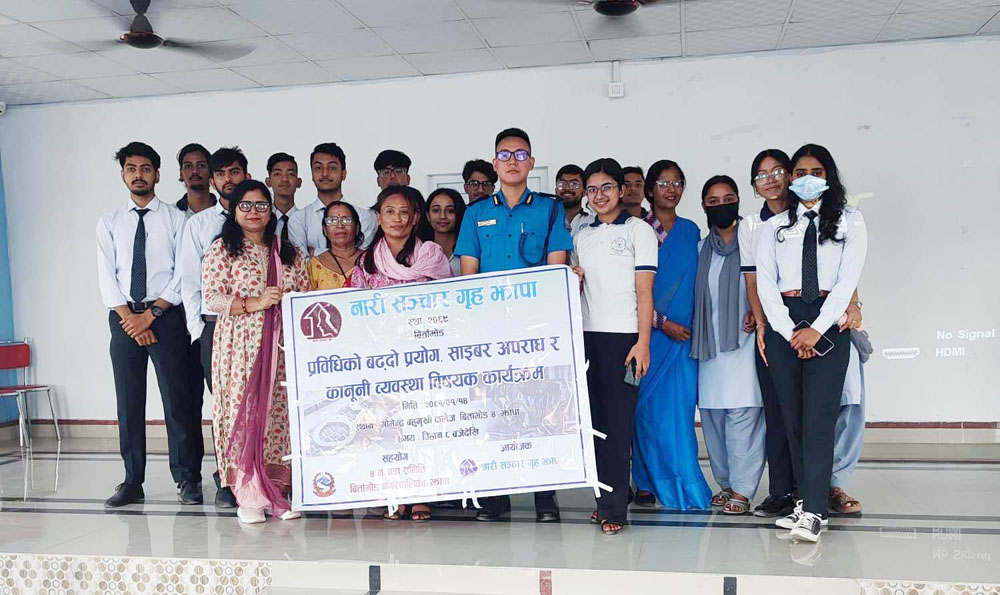 नारी सञ्चार गृह झापाकी अध्यक्ष रेजिना गौतमको अध्यक्षता तथा बिर्तामोड नगरपालिका ४ नम्बर वडाका वडाध्यक्ष राहुल शर्माको प्रमुख आतिथ्यमा सञ्चालित कार्यक्रममा प्रमुख अतिथि शर्माले प्रविधि अभिन्न अंग बनिसकेको अहिलेको युगमा प्रविधिको प्रयोगबाट हुने जोखिमबारे सबैले सचेत रहनुपर्ने बताए ।