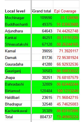 यस्तै, लक्ष्य हासिल गर्न नसक्ने सात पालिकामा अर्जुनधारामा ७४.४४ प्रतिशत, कमलमा ७१.३९, दमकमा ७२.९५, गौरादहमा ६६.९२, झापा गाउँपालिकामा ७६.६८, हल्दिबारीमा ७१.९७ र भद्रपुरमा ४५.७४ रहेको छ ।