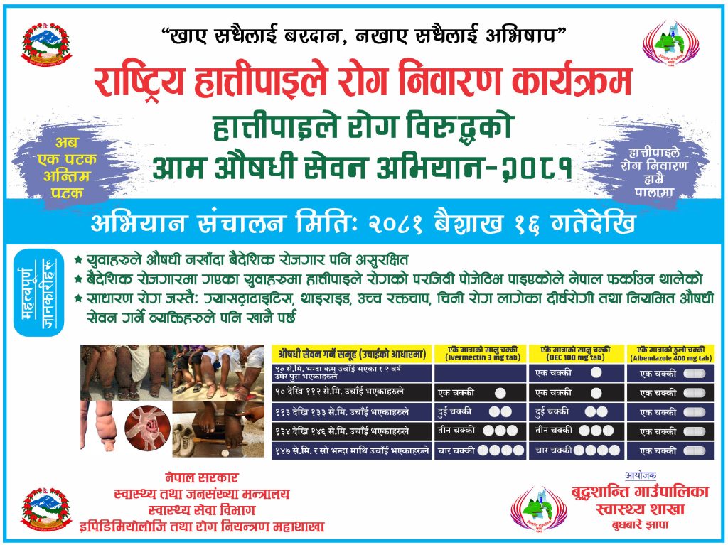 हात्तीपाइले रोगविरुद्धको औषधि सेवन दर ८० प्रतिशत भन्दा कम रहेको स्थानमा १० दिन थप गरिएको जनस्वास्थ्य अधिकृत श्रेष्ठले बताउनुभयो ।