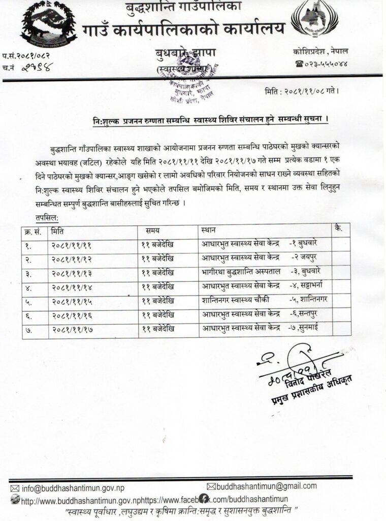पालिकाका ७ वटै वडाका स्वास्थ्य सेवा केन्द्रमा स्थानमा शिविर सञ्चालन हुने स्वास्थ्य शाखाले जनाएको छ । जस अन्तरगत वडा नं. १ मा ३९ जना, वडा नं. २ मा ६५ जना महिलाहरुको जाँच भइसकेको छ । अन्य वडामा पनि धमाधम जाँच भइरहेको स्वास्थ्य शाखाले जनाएको छ ।
